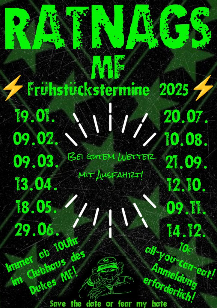 Wir treffen uns regelmäßig zum Frühstück im befreundeten Clubhaus der Dukes MF und planen unsere Ausfahrten und Wochenendtouren. Gäste sind hier – mit Anmeldung – immer herzlich Willkommen! Wann genau, könnt ihr auf unseren Social Media Seiten sehen.